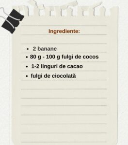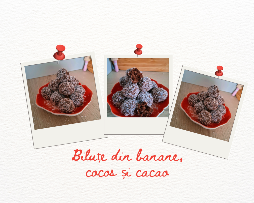 • Biluțele cu banană, cocos și cacao pot fi servite ca gustare rapidă între mese, alături de un pahar de lapte sau o băutură vegetală ( băutură de migdale, de cocos, soia), pentru un moment dulce și echilibrat.